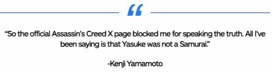 Kenji Yamamoto在推特上多次抨击弥助引发争议。不过,他表示自己在说出真相后,《刺客信条》官方账号屏蔽了他。