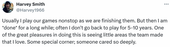 “在游戏开发过程中,我经常一刻不停地重复游玩自己的游戏,因为作为游戏开发者需要凭此不断完善打磨游戏。但在游戏正式完成封盘后的5-10年内我都不会去碰他,”Smith解释说:“这样做的一大乐趣在游戏中发现团队制作的我喜欢的小区域和小巧思,会让我感到很暖心。”