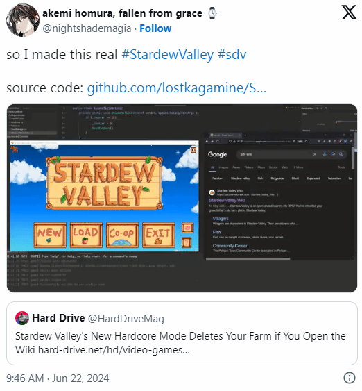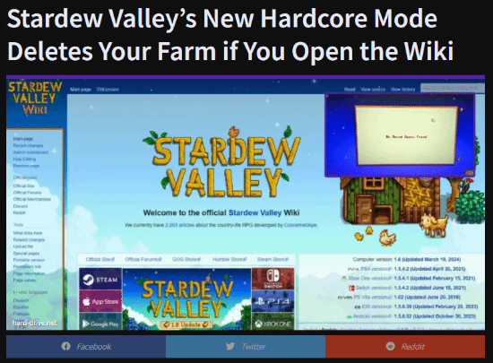 近期,Hard Drive网站发布了一篇洋葱新闻,称《星露谷物语》推出了新的硬核模式——如果你查询游戏的Wiki百科,系统就会自动删除你的农场。受文章启发,一位软件工程师真的开发出了这样一款Mod。