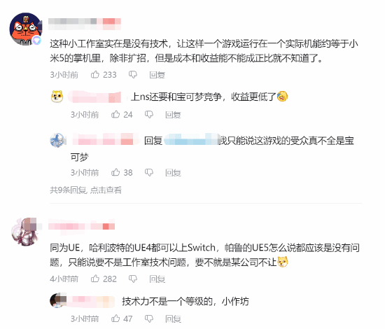另一些网友则指出,同样使用虚幻引擎(UE)的哈利波特游戏(指《霍格沃茨之遗》)在Switch上运行良好,认为《幻兽帕鲁》应该没有技术上的问题。有网友表示:“同为UE,哈利波特的UE4都可以上Switch,帕鲁的UE5怎么说都应该是没有问题,只能说要不是工作室技术问题,要不就是某公司不让。”