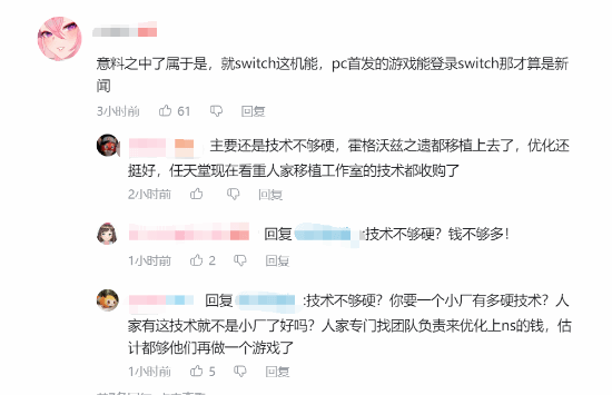 另一些网友则强调技术实力的重要性,指出其他高要求的游戏都能成功移植到Switch平台:“主要还是技术不够硬,霍格沃兹之遗都移植上去了,优化还挺好,任天堂现在看重人家移植工作室的技术都收购了。”