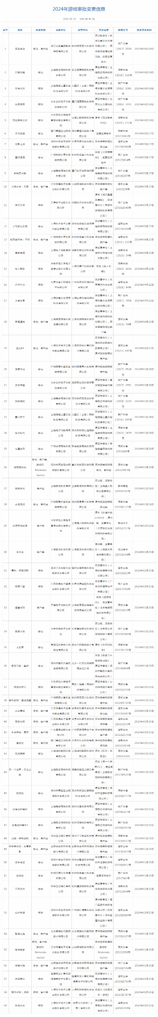 此外,出版总署还公布了《2024年游戏审批变更信息》。