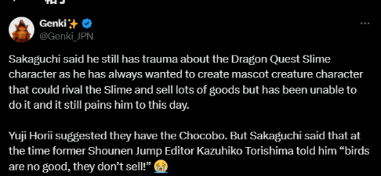 堀井雄二曾建议《最终幻想》用陆行鸟Chocobo来当吉祥物,但当时《周刊少年》的编辑Kazuhiko Torishima告诉坂口博信“陆行鸟不合适,它卖不出去”,Torishima认为史莱姆之所以深受欢迎是碰巧赶上好时候了。