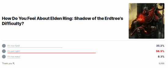 近日,IGN在主站发起了一项投票,询问玩家对《艾尔登法环:黄金树幽影》难度的看法。出人意料的是,近1万名投票者中,超半数的玩家认为难度正好。