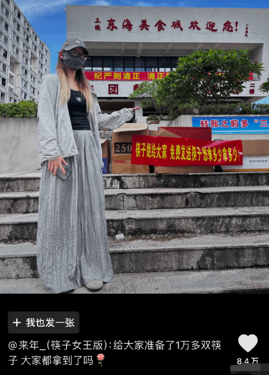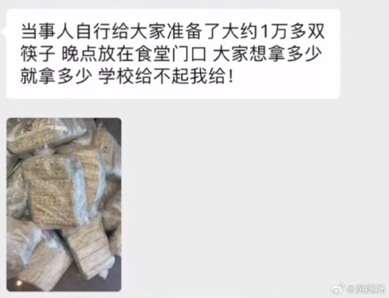 她现在买了一万双一次性筷子在她们大学食堂门口免费发放,说学校给不起,我给!想拿多少拿多少。