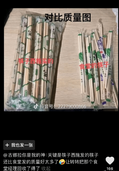 如今拿到筷子的的同学喊她叫筷子西施,一对比发现她送大家的筷子比食堂的质量还好。