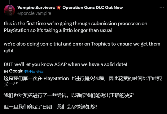 开发商解释《吸血鬼幸存者》PS版延期原因 第一次申请上架不够熟练