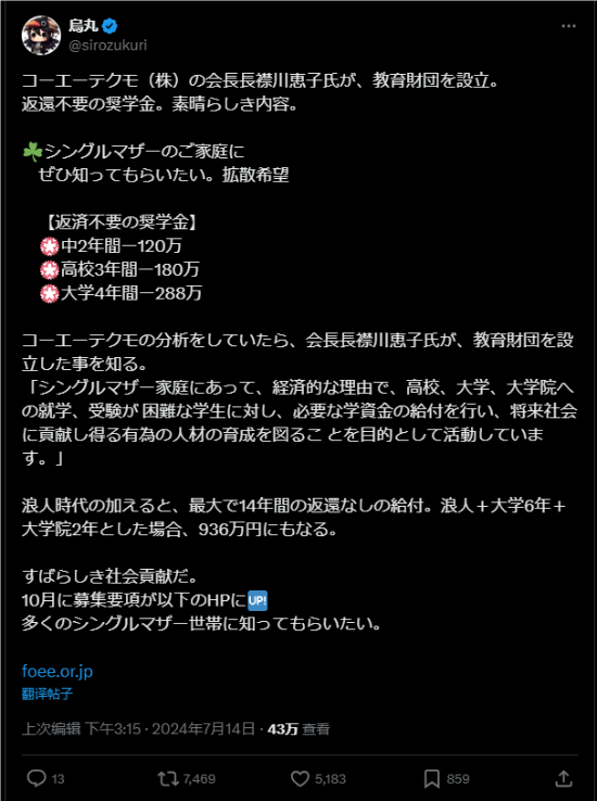 光荣特库摩会长襟川惠子设立教育基金会 令网友赞不绝口