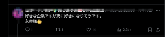 推特评论区不少玩家都对这一慈善行为发表了赞赏。有网友表示:“本来很喜欢这个企业的,现在更喜欢了!给‘女帝大人’点赞!”